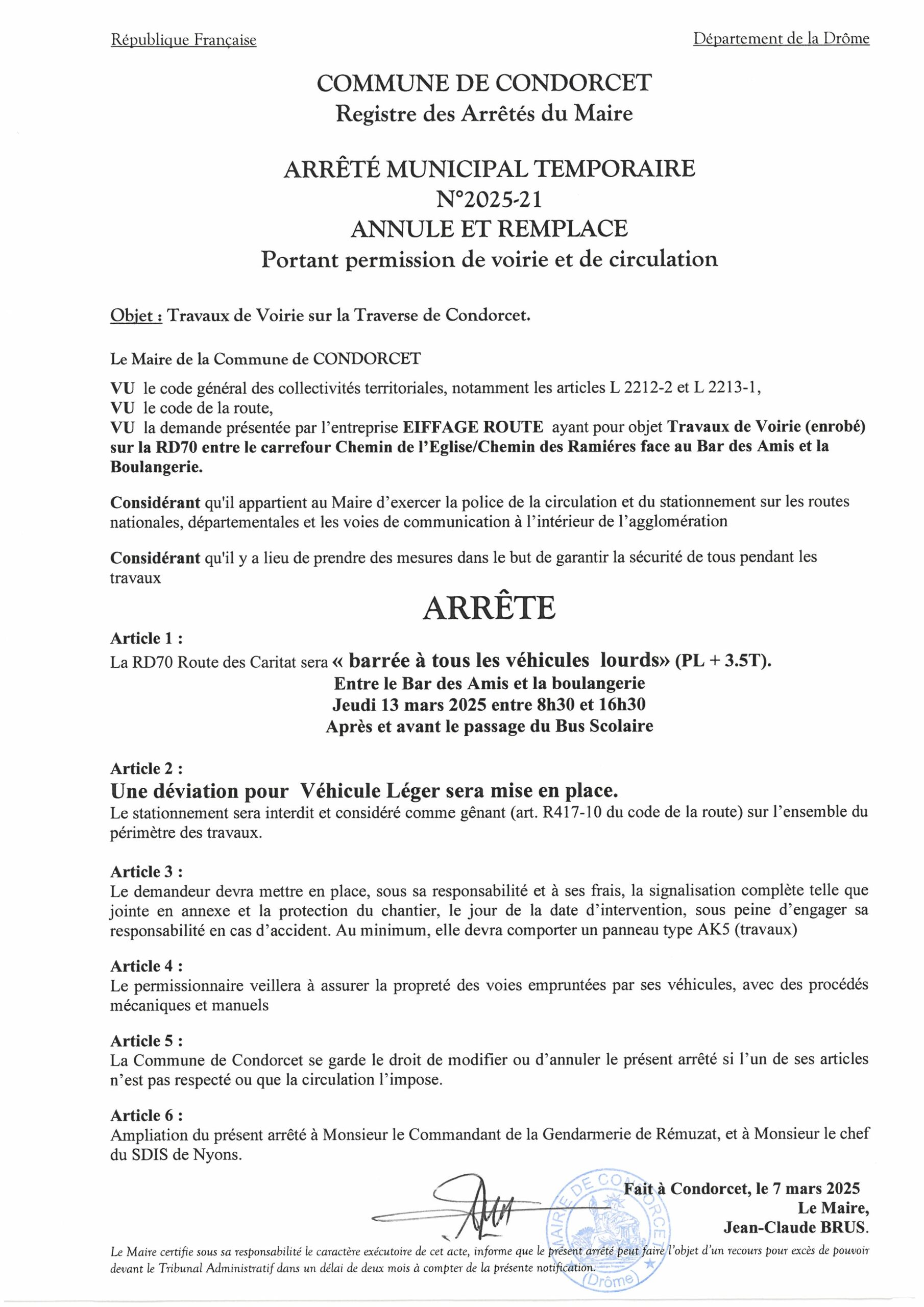 2025-21 ARRETE MINICIPAL TEMPORAIRE ANNULE ET REMPLACE ROUTE BARREE POIDS LOURDS A CONDORCET LE 13 03 2025 DE 8H30 A 16H30 (1) par | | 0